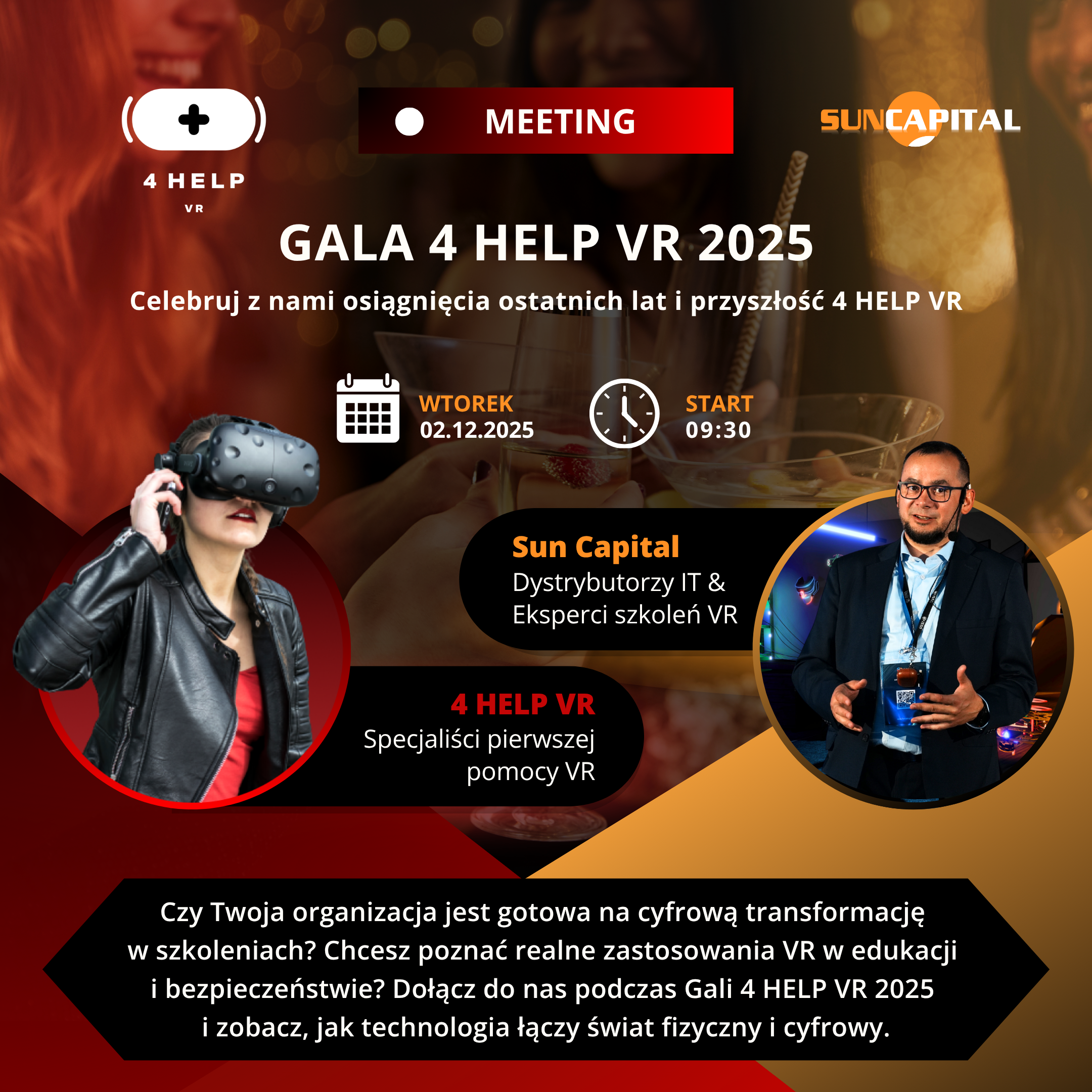 2 grudnia 2025 roku we Wrocławiu odbędzie się wyjątkowe wydarzenie – Gala 4 HELP VR 2025, organizowana przez firmę 4 HELP VR, z udziałem Sun Capital jako partnera technologicznego. Spotkanie poświęcone będzie integracji środowiska ekspertów VR, cyberbezpieczeństwa i edukacji, a także omówieniu kierunków rozwoju nowoczesnych narzędzi szkoleniowych.