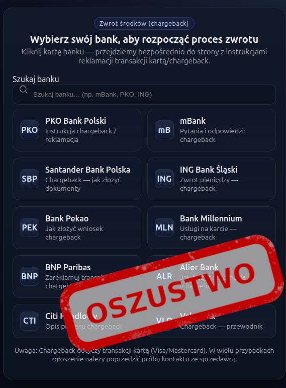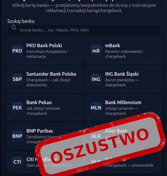 Po przejściu na stronę przestępcy umożliwiają wybór banku (np. PKO BP, mBank, Santander, ING, Millennium, BNP Paribas itp.), a następnie proszą o wypełnienie formularza, w którym należy wpisać: