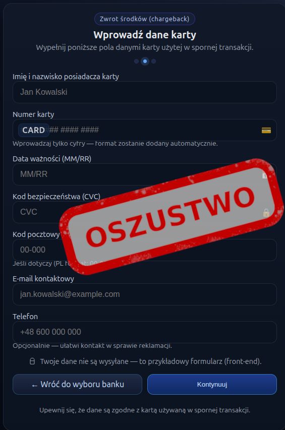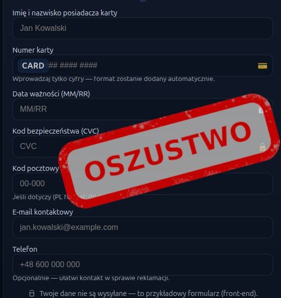 Formularz wygląda wiarygodnie, jednak wszystkie dane trafiają bezpośrednio do oszustów.