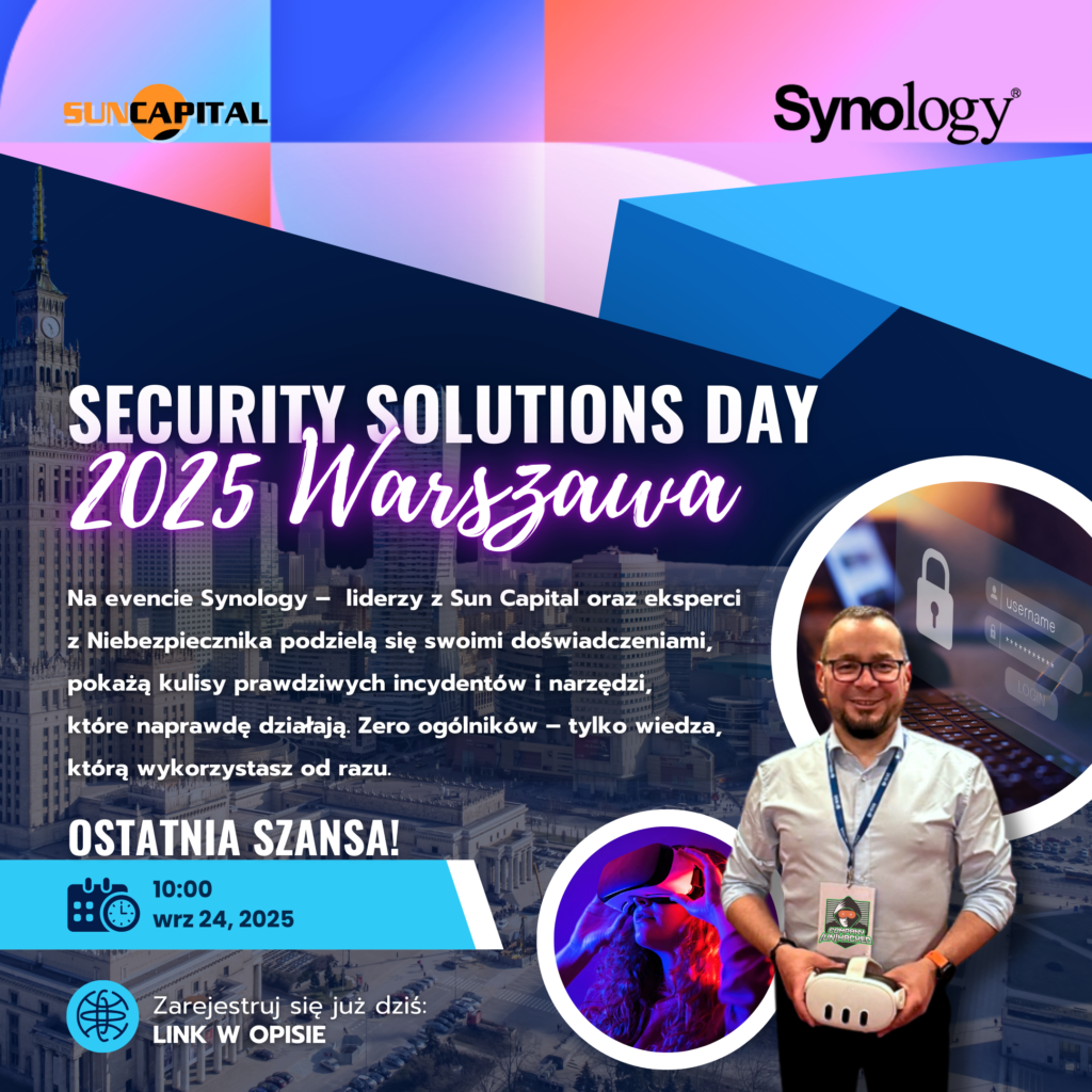 Synology Security Solutions Day 2025 łączy najnowsze technologie z praktyczną wiedzą o zagrożeniach i odporności cyfrowej. Dzięki obecności partnerów – takich jak Sun Capital, Niebezpiecznik.pl, AMD i Evernex – zyskasz nie tylko wiedzę, ale i konkretne narzędzia do budowania bezpiecznej przyszłości IT. Do zobaczenia 24 września w Warszawie